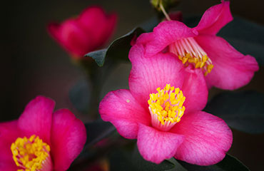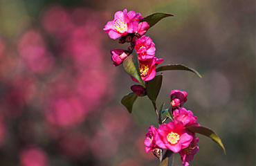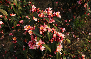花玫瑰紅色,半重瓣型,花瓣9-11枚,小型花,平均花徑2.64cm。多枚花蕾頂生或腋生,開花極其繁密。花期2月下旬-4月,長達40天左右。嫩葉紫紅色,成熟葉片濃綠色。植株立性,緊湊,常綠。