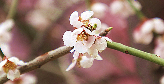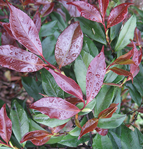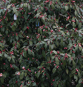 灌木,垂枝;枝葉繁密,嫩枝黃褐色,芽紫紅色,簇生。葉披針形,常扭曲下垂,互生幾近十字狀排列,長(zhǎng)5.0-8.2 cm ,寬1.8-2.2 cm,橫截面平坦,葉脈中等,葉厚度中等,細(xì)齒緣,葉基楔形,葉尖長(zhǎng)尾尖,葉柄短,葉面光澤弱,葉背無(wú)毛,嫩葉深紫紅色,成熟葉片綠色或深綠色。花芽多枚頂生或腋生,萼片覆瓦狀排列,卵形,褐色;花小,單瓣,花瓣頂端微凹,邊緣全緣,花瓣卵形,花瓣5枚,花徑2.5-3.5 cm,花粉白色(Red Group-52-D),雄蕊筒形,基部合生,柱頭3淺裂,雌蕊等高或高于雄蕊,子房無(wú)毛,中花期,上海地區(qū)3月上旬-4月上旬。